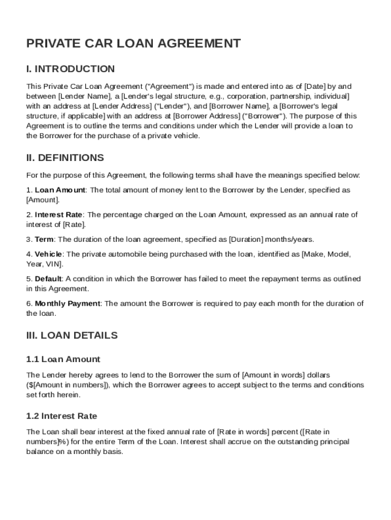 This document outlines the terms and conditions for a loan provided by the lender to the borrower for the purchase of a private vehicle.