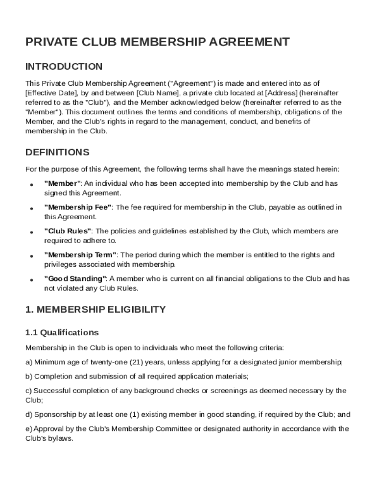 This document outlines the terms and conditions of membership, obligations of the Member, and the Club\'s rights regarding the management and benefits of membership in the Club.