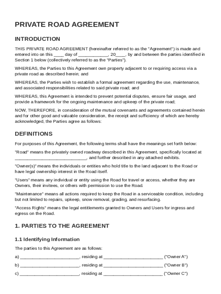 A Private Road Agreement is a legal document that outlines the rights and obligations of parties regarding a private road, detailing access rights, maintenance duties, and usage rules.