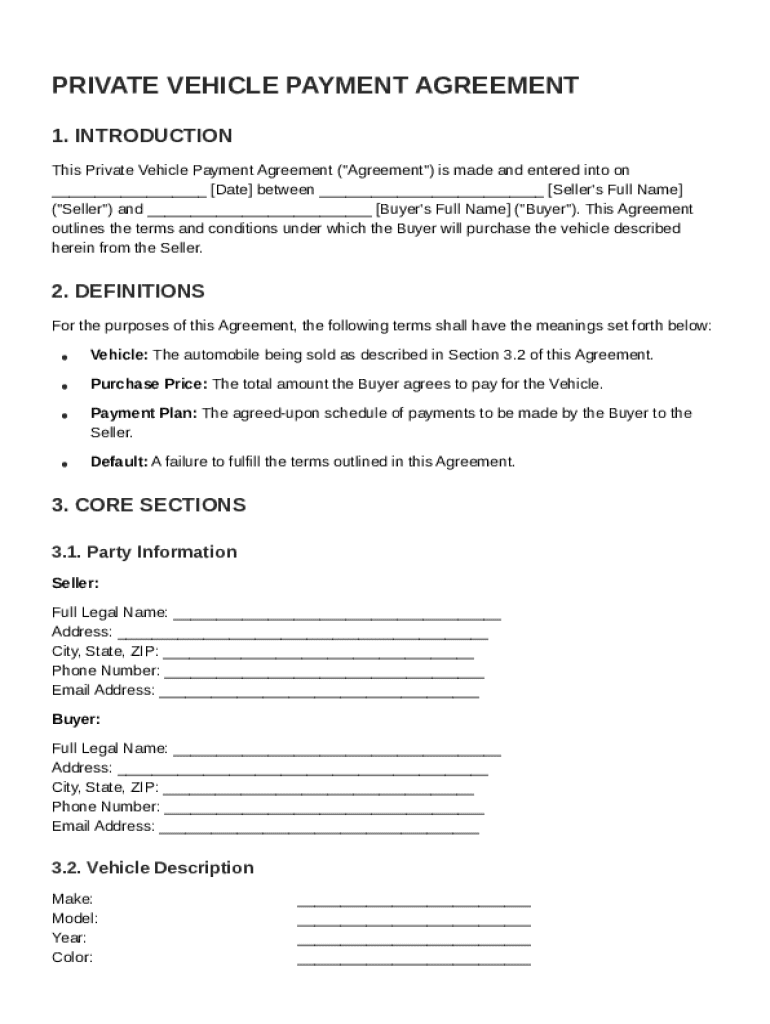 Main sections and clauses of a Private Vehicle Payment Agreement