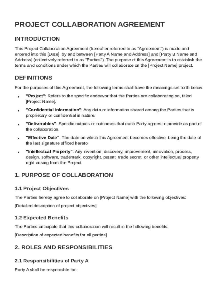 The Project Collaboration Agreement Template is a formal document outlining the roles, responsibilities, and expectations of parties involved in a collaborative project.