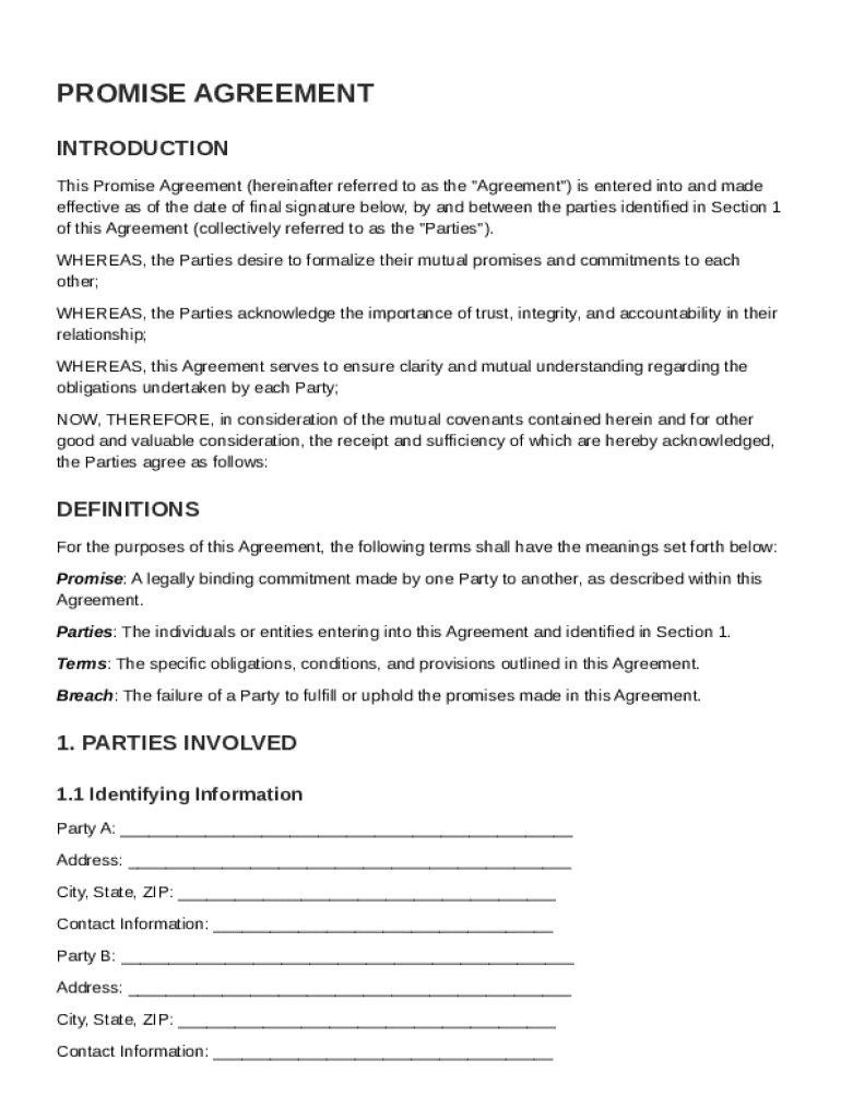 A promise agreement is a legally binding document that outlines the obligations and commitments between parties. Having a written agreement is crucial in both personal and professional settings, providing clarity and helping to prevent disputes. Understanding the promise agreement process can save parties time and effort by clearly delineating expectations.