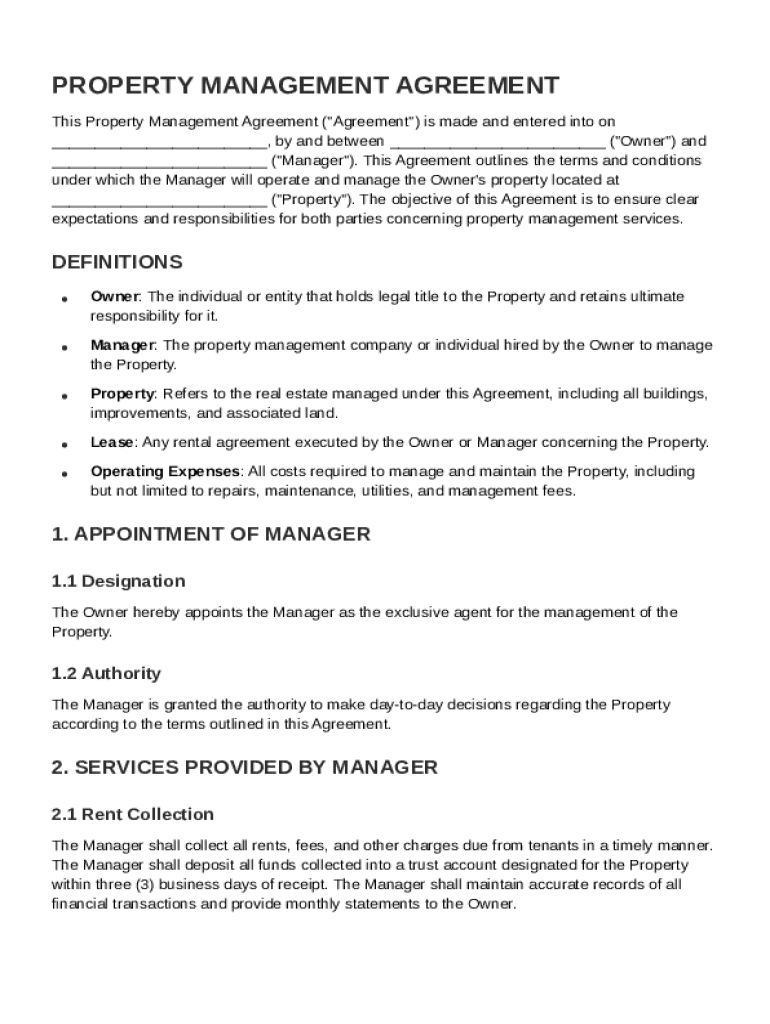 This document outlines the terms and conditions of a property management agreement between an Owner and a Manager, defining the responsibilities and services provided in handling the Property.