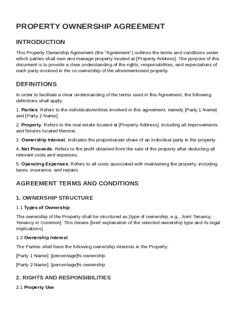 A Property Ownership Agreement Template is a legal document that outlines the terms of ownership and responsibilities of parties involved in a property co-ownership arrangement.