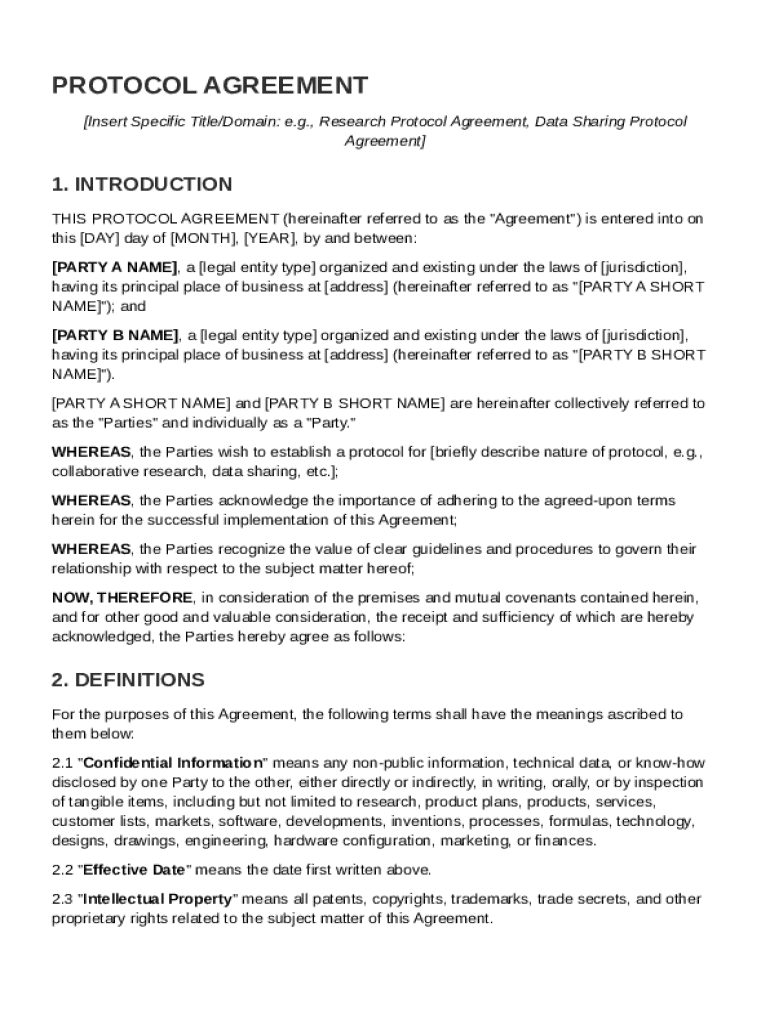 A Protocol Agreement Template is a standardized document outlining the terms and conditions governing a specific agreement between parties.