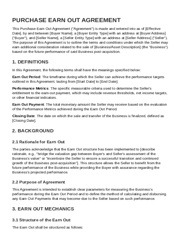 A well-crafted Purchase Earn Out Agreement should outline several critical components that define the arrangement and clarify expectations. These components dictate how and when the seller will receive any potential earn-out payments.