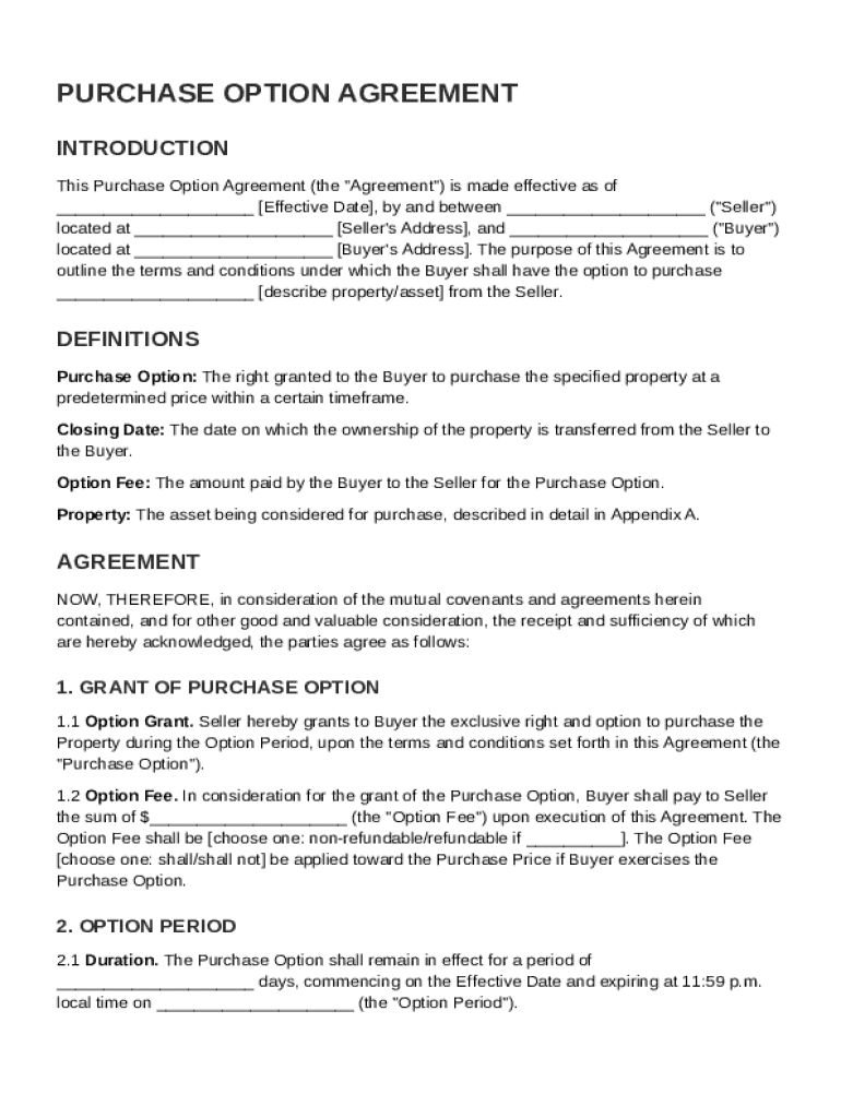 The Purchase Option period encompasses the duration the buyer has to exercise their purchasing rights. Specify the timeframe clearly in the agreement, and keep in mind deadlines, as exercising the option late could lead to forfeiture.