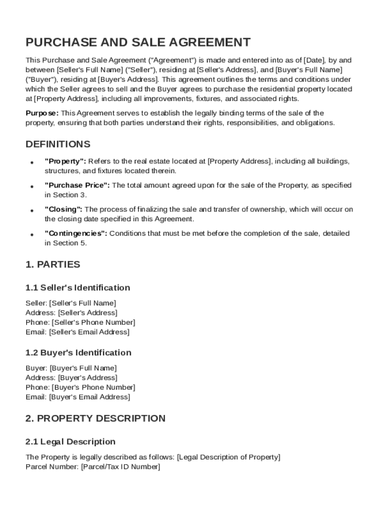 A Purchase and Sale Agreement is a legal document where a seller agrees to sell and a buyer agrees to buy real property under specific terms.