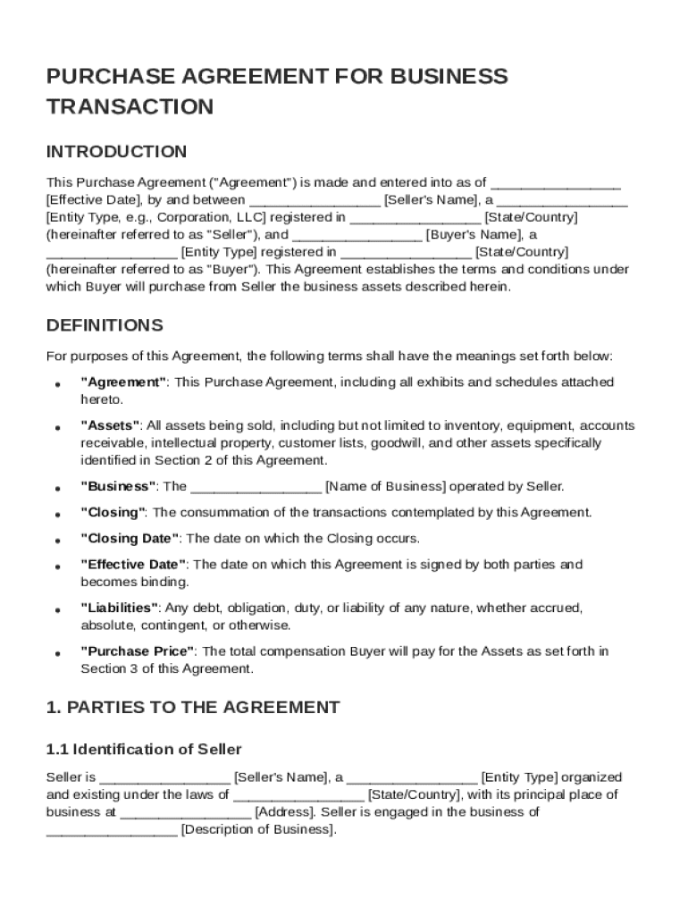 This document is a Purchase Agreement made between a Seller and a Buyer for the purchase of business assets, outlining terms, conditions, representations, and warranties regarding the transaction.