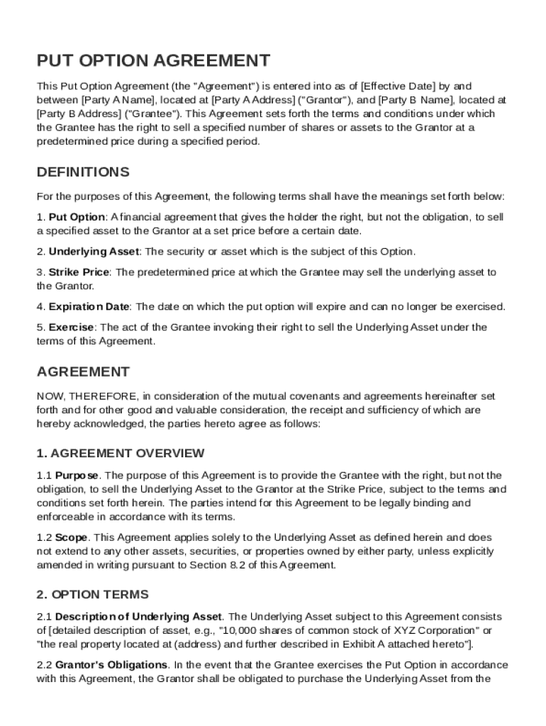A Put Option Agreement Template is a legal document that outlines the terms under which one party can sell an asset to another party at a predetermined price within a specific time frame.
