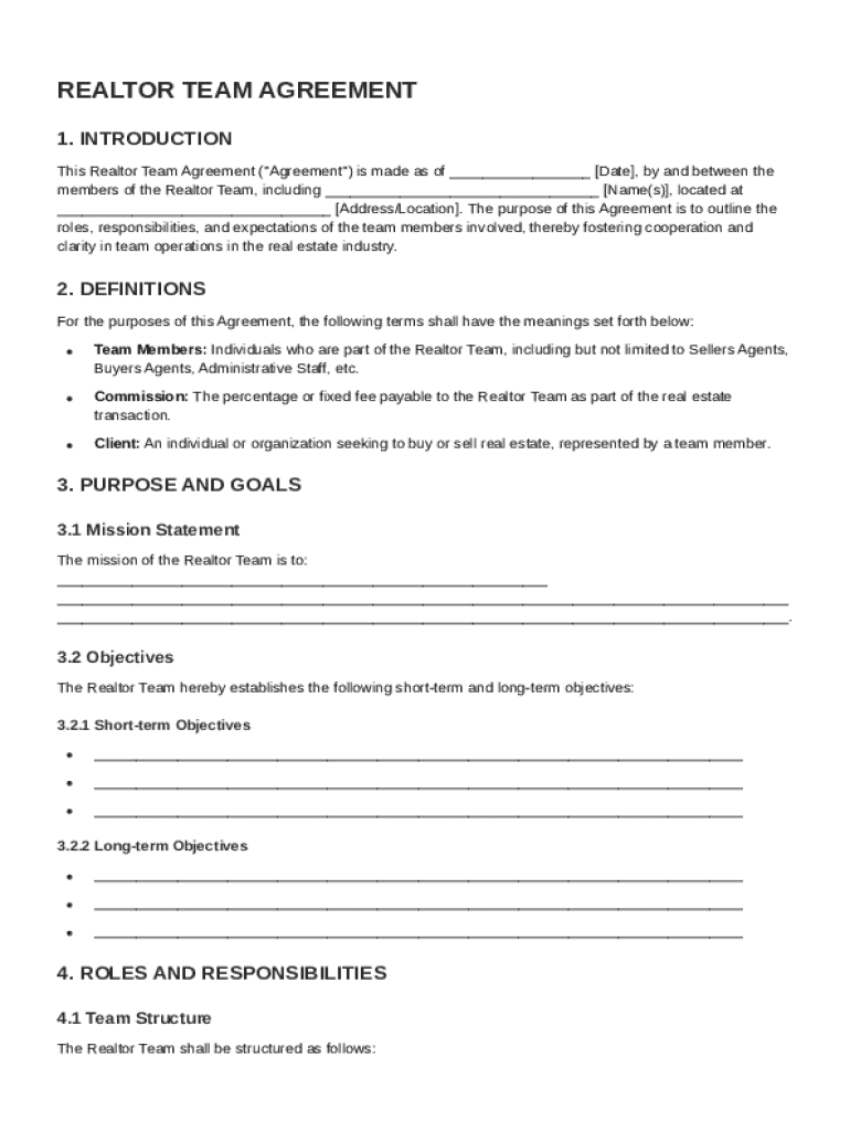This Agreement outlines the roles, responsibilities, and expectations of members of a Realtor Team in the real estate industry, facilitating cooperation and clarity.