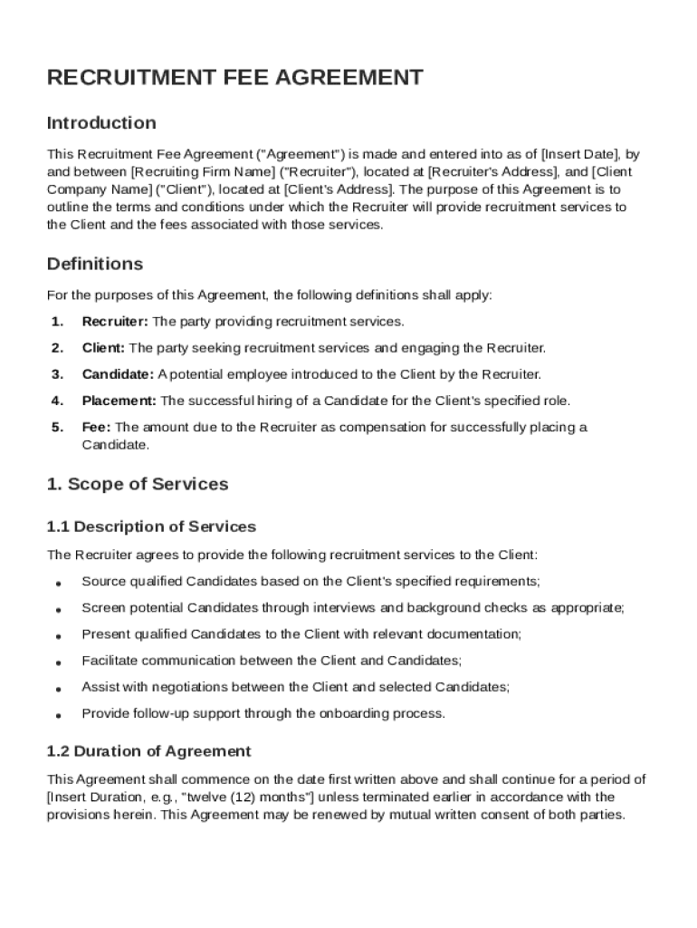 A Recruitment Fee Agreement Template is a formal document that outlines the terms and conditions under which a recruitment agency will be compensated for finding suitable candidates for a company.