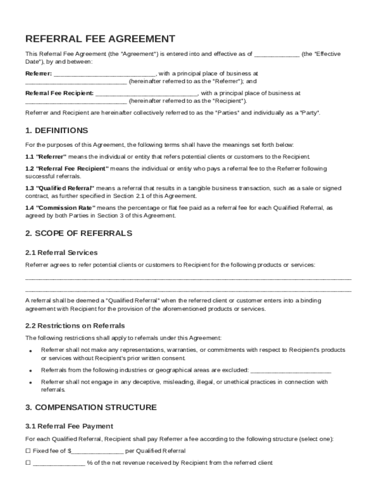 This document outlines the terms and conditions regarding the referral fee arrangement between the Referrer and the Referral Fee Recipient, including definitions, obligations, compensation structure,