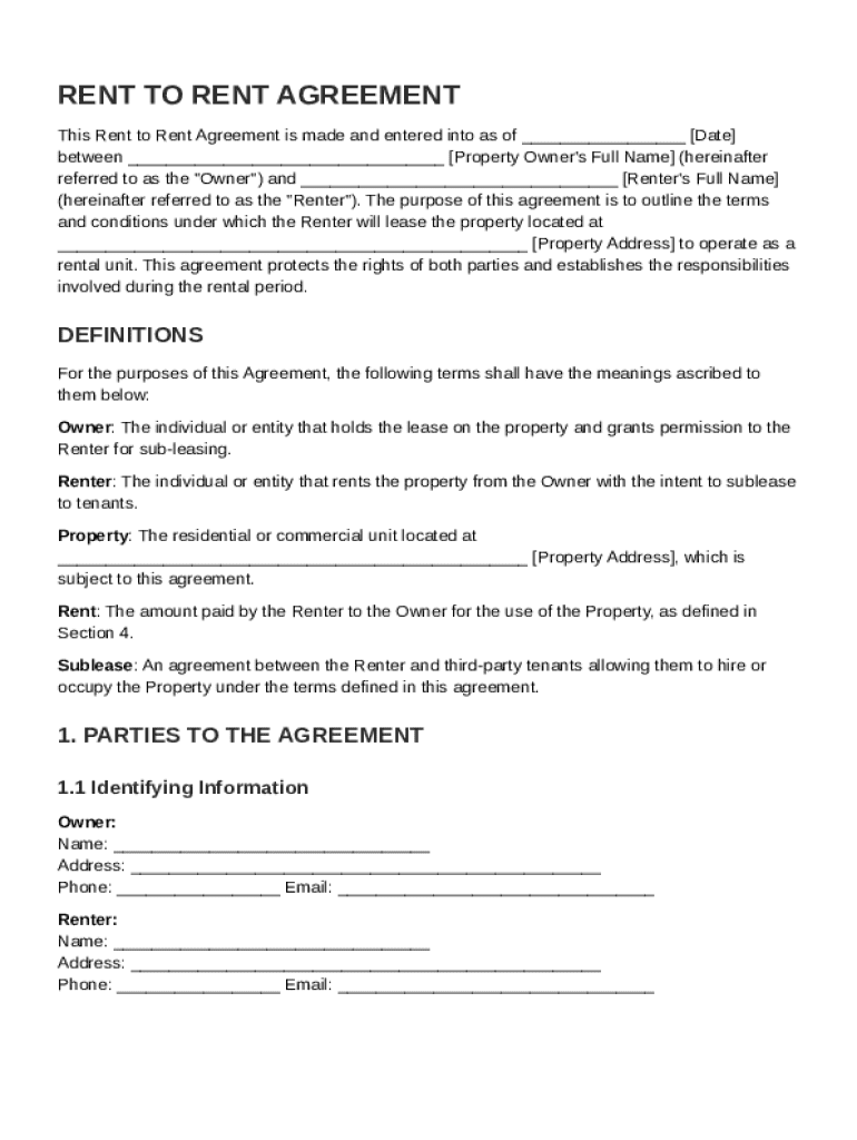 The agreement should clearly identify the parties involved, specifying full names and contact details of both the owner and renter.