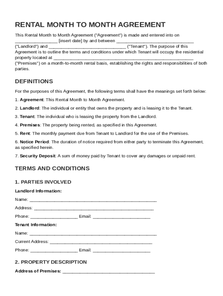 A Rental Month to Month Agreement Template is a legal document that outlines the terms and conditions for renting a property on a month-to-month basis.