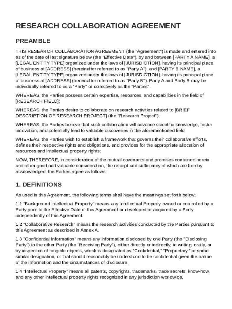 A Research Collaboration Agreement Template is a structured document that outlines the terms and conditions for collaborative research projects between parties.