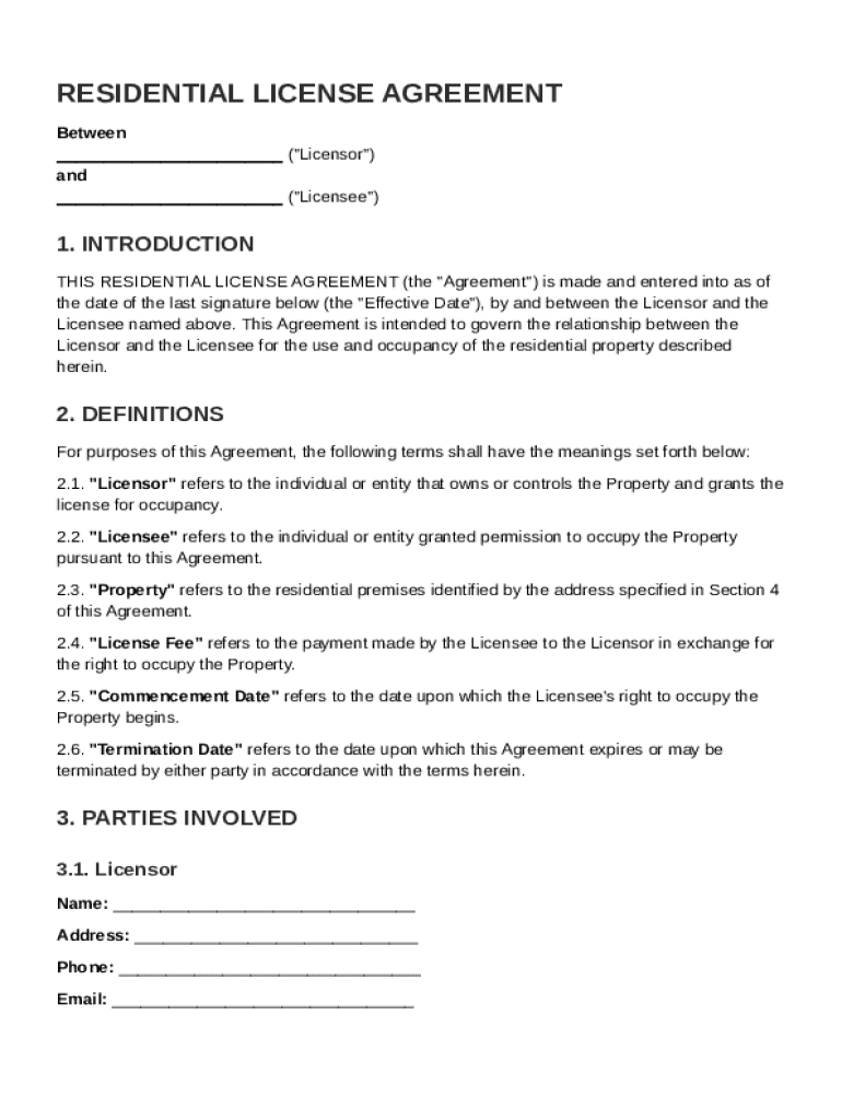 This document governs the relationship between the Licensor and Licensee for the use and occupancy of a residential property.