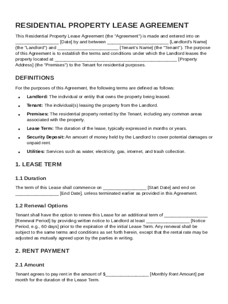 A Residential Property Lease Agreement is a legal document that outlines the terms and conditions under which a landlord rents out a property to a tenant. This document is essential as it establishes the legal framework for the rental arrangement, detailing both parties' rights and responsibilities.