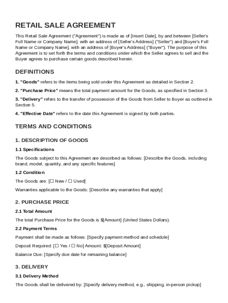 The Retail Sale Agreement Template is a legal document outlining the terms and conditions of the sale of goods between a buyer and a seller.