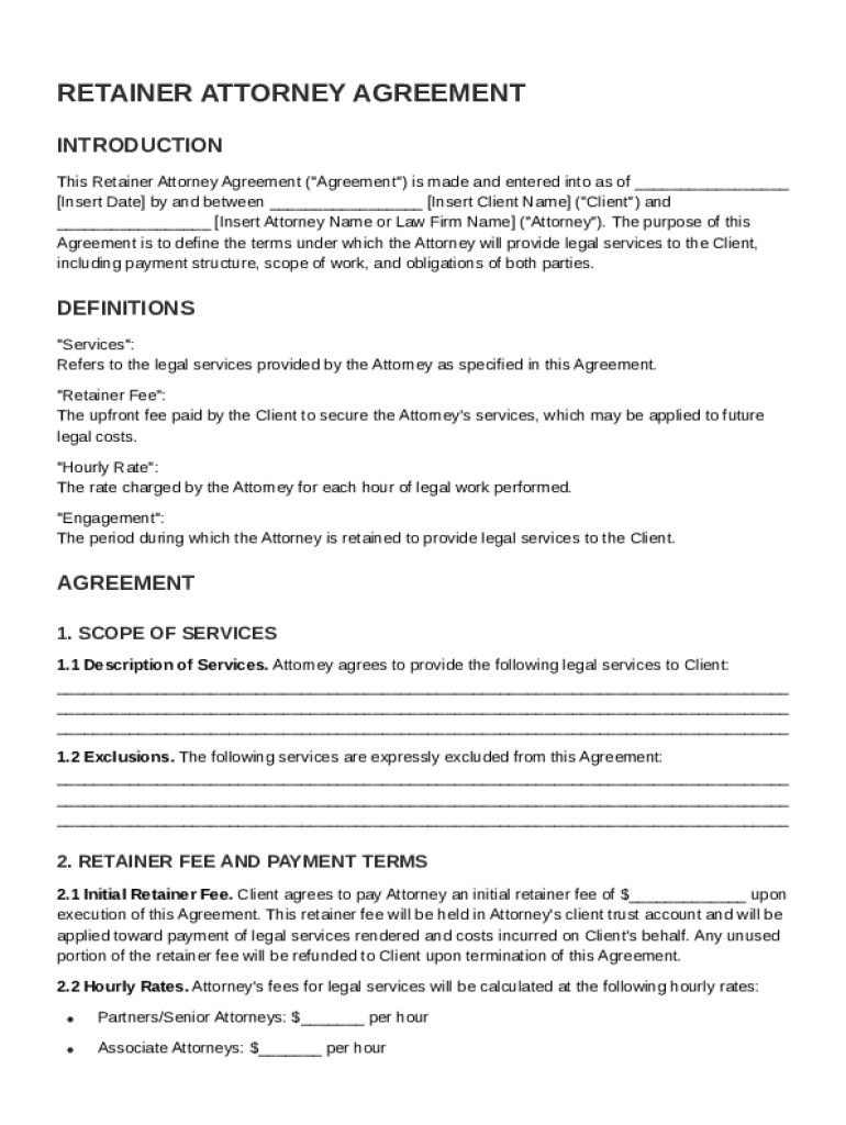 A retainer attorney agreement is a foundational document that outlines the relationship between an attorney and their client. It establishes the scope of services, the retainer fee structure, and payment terms. Understanding the various parts of this agreement is essential for both parties to ensure clarity and prevent disputes.