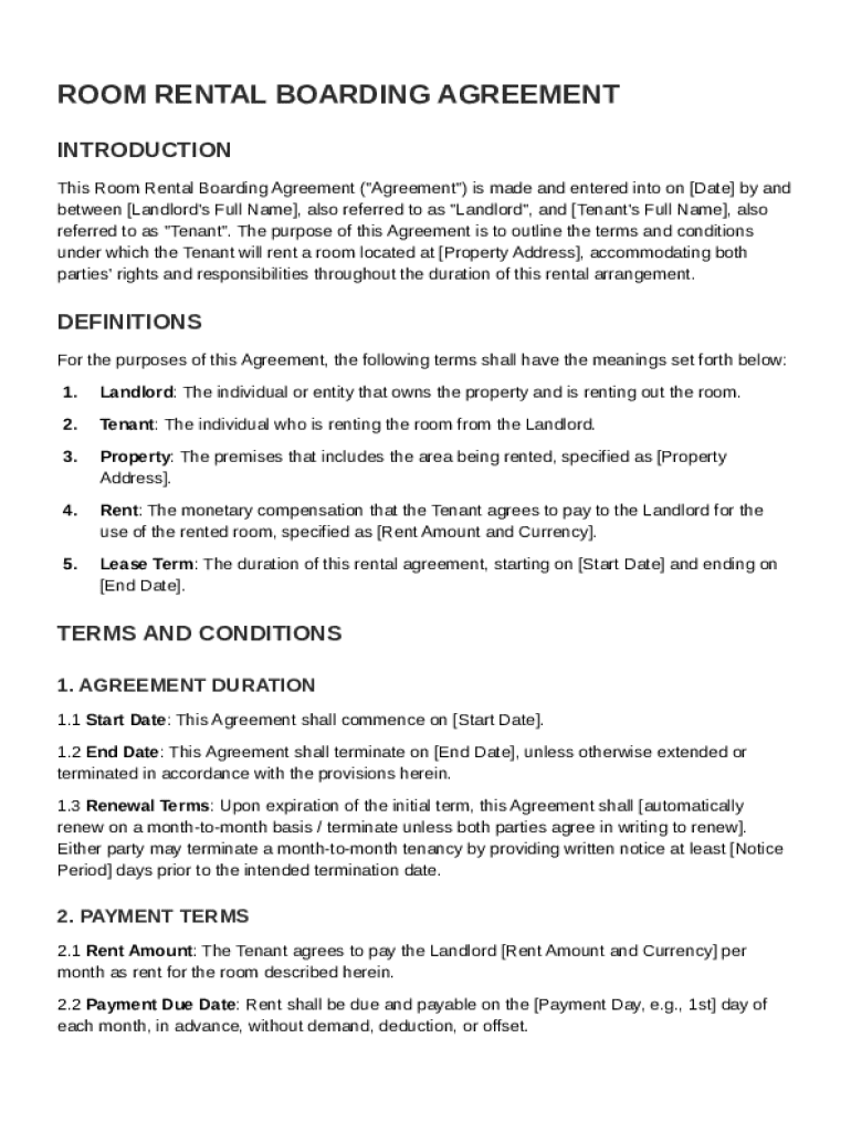This document outlines the terms and conditions of a rental arrangement between a landlord and a tenant for a room rental, including definitions, payment terms, maintenance responsibilities, and conditions
