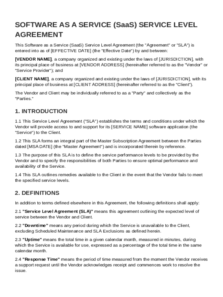 This document outlines the service level expectations and responsibilities between a Vendor and a Client regarding the provision of a SaaS software application.