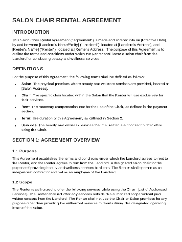 This document outlines the terms and conditions under which a Renter leases a salon chair from a Landlord for conducting beauty and wellness services.