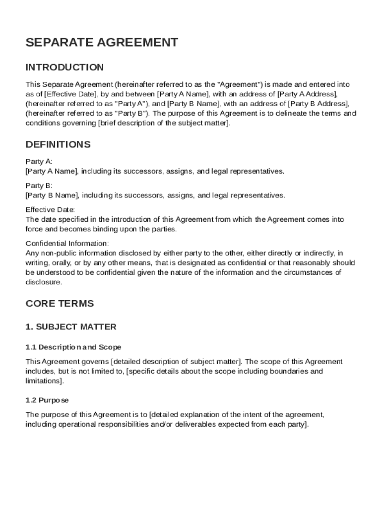 When creating a separate agreement template, several key elements must be included. This ensures that the agreement is comprehensive and legally binding. The introduction should clarify the purpose of the agreement, while definitions establish who the parties are. The core terms will describe the subject matter and set limits on the scope.