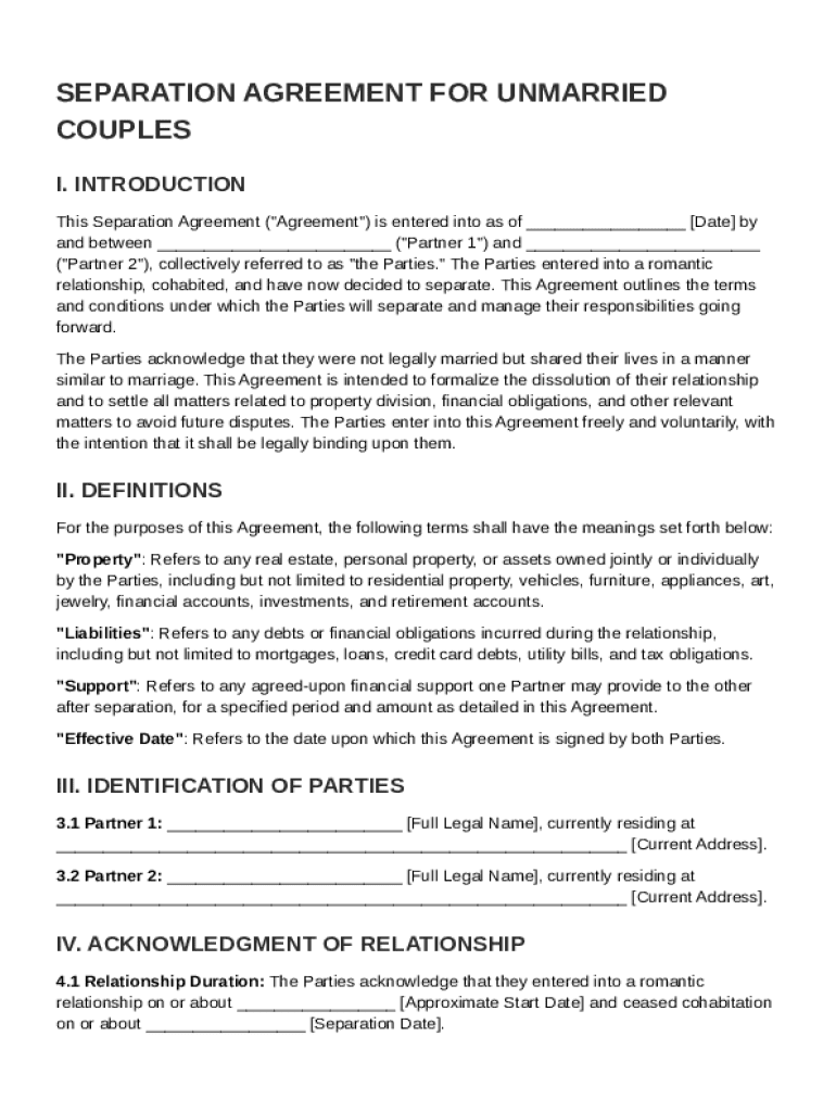 This document outlines the terms and conditions under which unmarried couples will separate, including property division, financial obligations, support arrangements, and child custody matters.