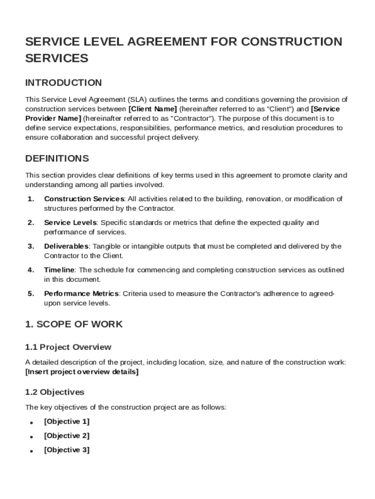 This Service Level Agreement outlines the terms and conditions for construction services between a Client and a Contractor, detailing service expectations, responsibilities, performance metrics, and