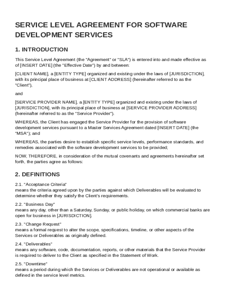 This document outlines the terms and conditions for a Service Level Agreement (SLA) between a client and service provider regarding software development services, including service levels, performance