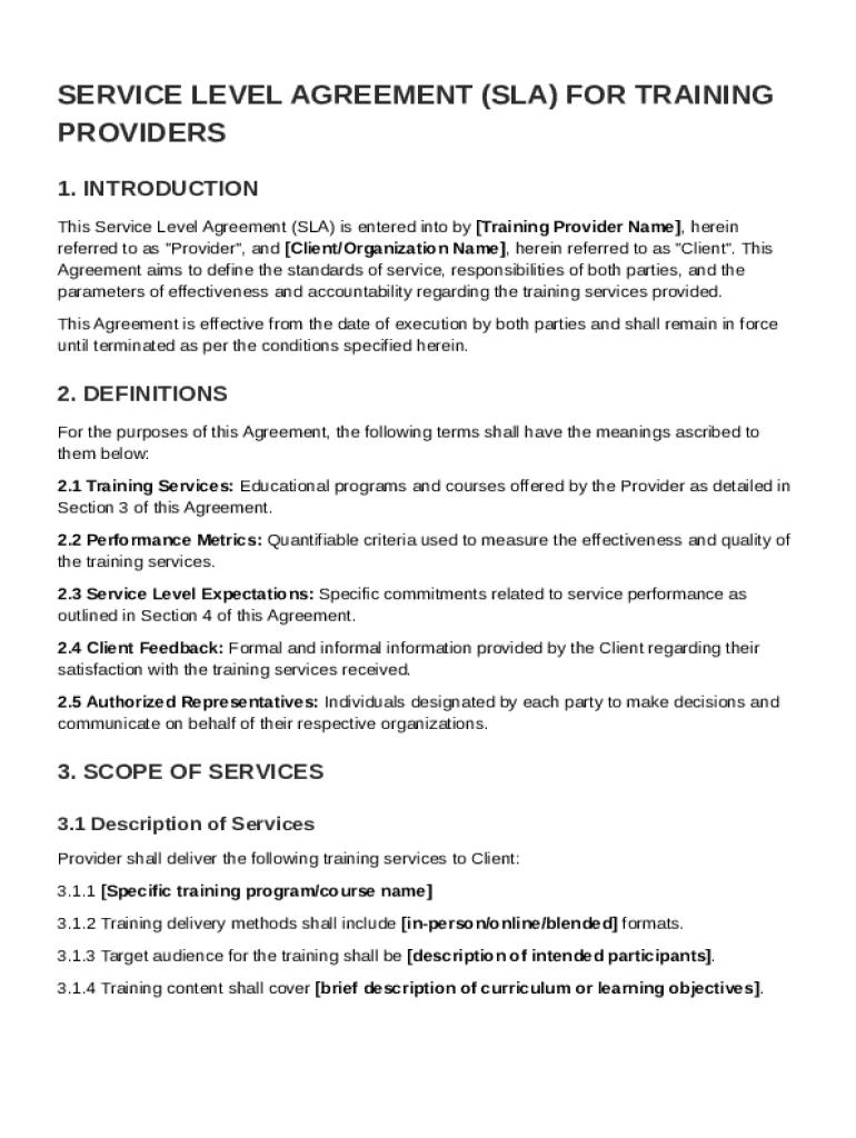 The SLA should outline the parties involved, typically the training provider and the client. Additionally, it should define the purpose of the agreement, which includes establishing service standards and accountability. Furthermore, mentioning the duration of the SLA, including effective dates and terms, is crucial to ensure clarity.