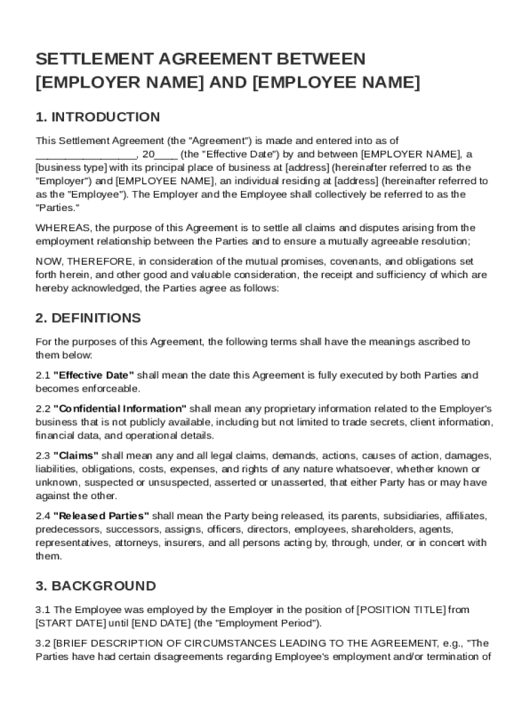 A settlement agreement serves as a resolution for disputes arising from the employment relationship, detailing obligations for both parties involved.