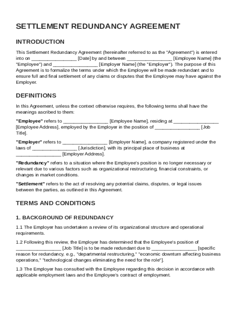 A Settlement Redundancy Agreement is a formal document between an employer and an employee outlining the terms of redundancy. It is crucial to define redundancy clearly to avoid future disputes.