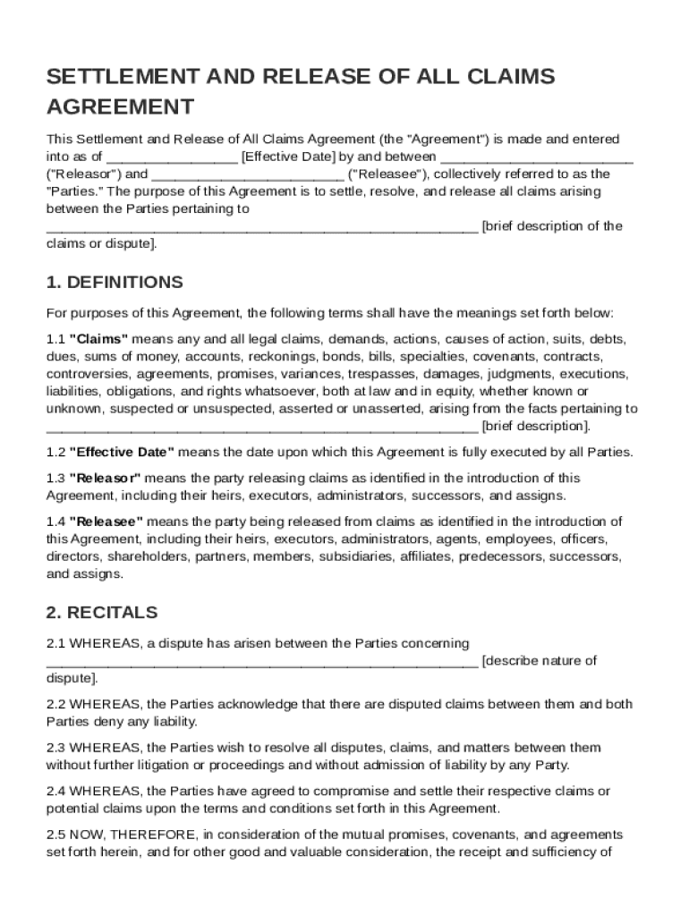 This document serves as a legal agreement between two parties to settle and release all claims arising between them. It outlines the definitions, terms of the settlement payment, the release of claims,
