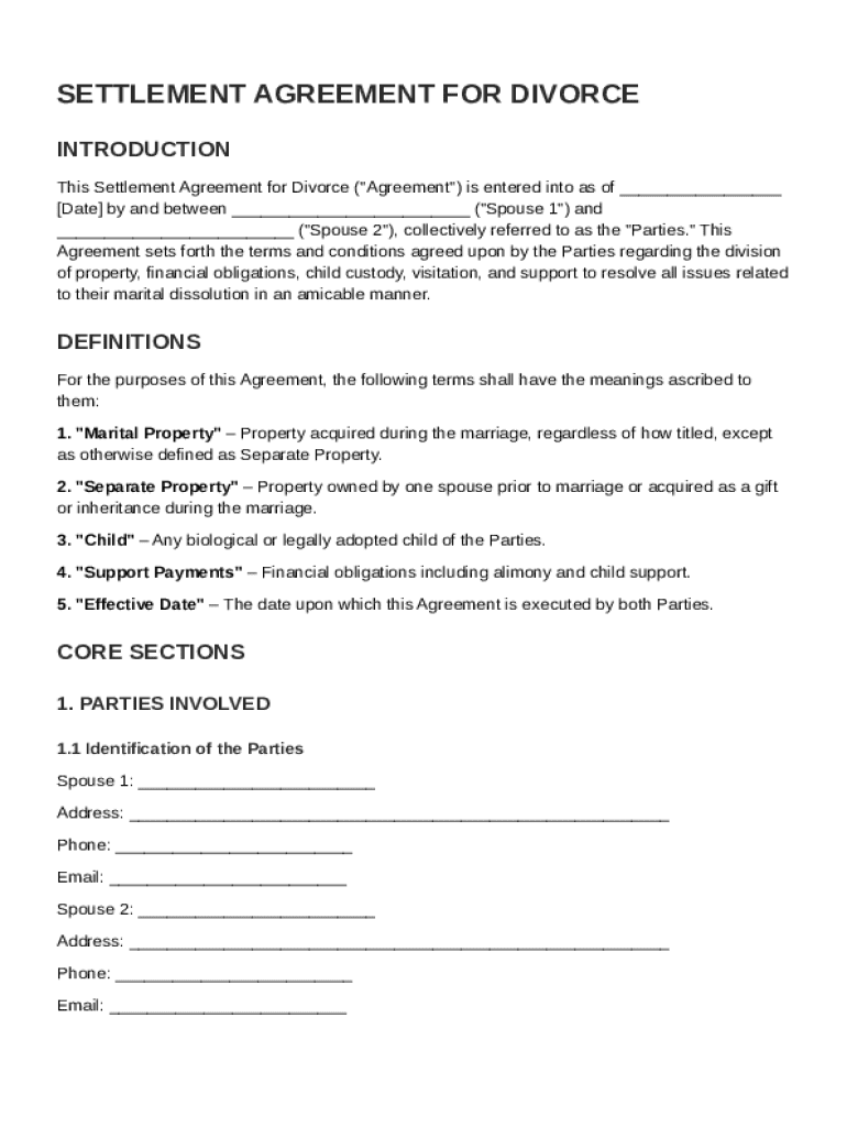 A Settlement for Divorce Agreement Template is a legal document outlining the terms agreed upon by both parties during a divorce, including asset division, child custody, and support arrangements.