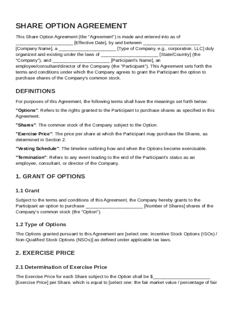 A Share Option Agreement Template outlines the terms under which an employee can purchase shares in a company at a predetermined price.