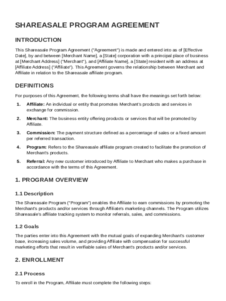 The Shareasale Program Agreement serves as a foundational document that outlines the relationship between merchants and affiliates. It ensures that both parties have a clear understanding of their roles, responsibilities, and the parameters within which they operate.