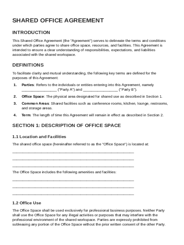 A Shared Office Agreement Template is a legal document that outlines the terms and conditions for sharing office space between multiple parties.