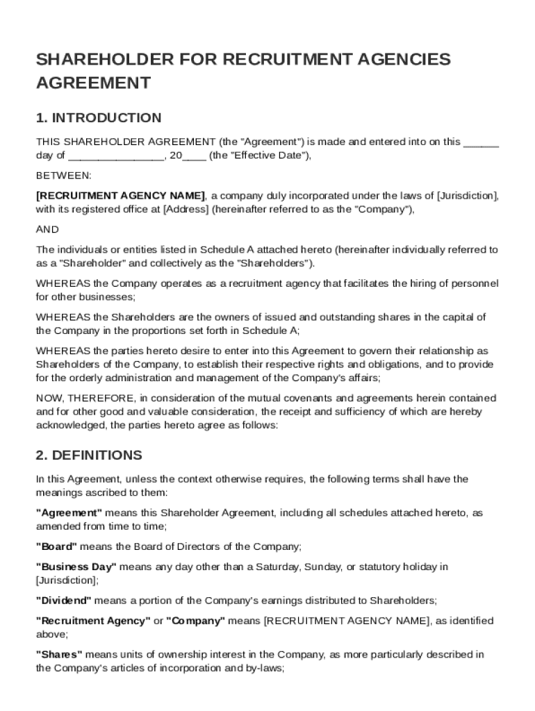 Shareholder for Recruitment Agencies Agreement Template free printable template