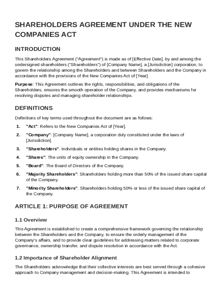 This Shareholders Agreement governs the relationship among the shareholders and between shareholders and the Company under the New Companies Act, outlining rights, responsibilities, and dispute resolution