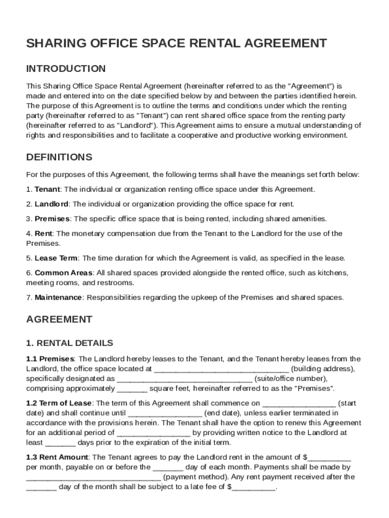 The Sharing Office Space Rental Agreement Template is a legal document that outlines the terms and conditions for renting shared office space between parties.