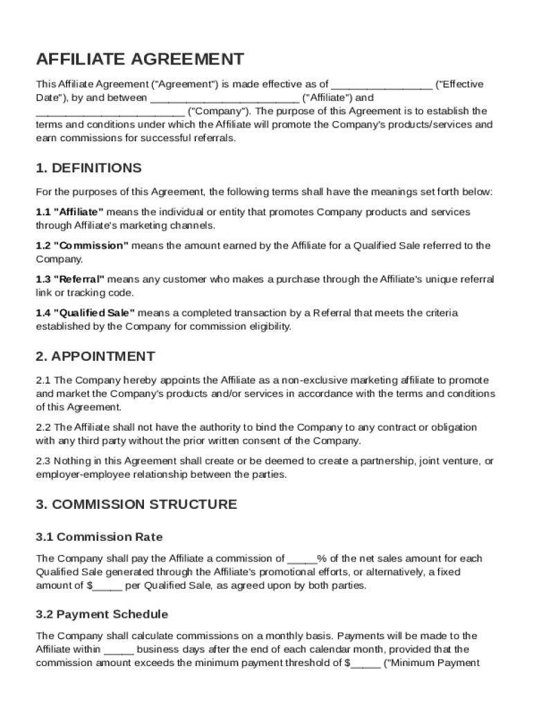 This Affiliate Agreement establishes the terms under which the Affiliate will promote the Company\'s products and earn commissions for successful referrals.
