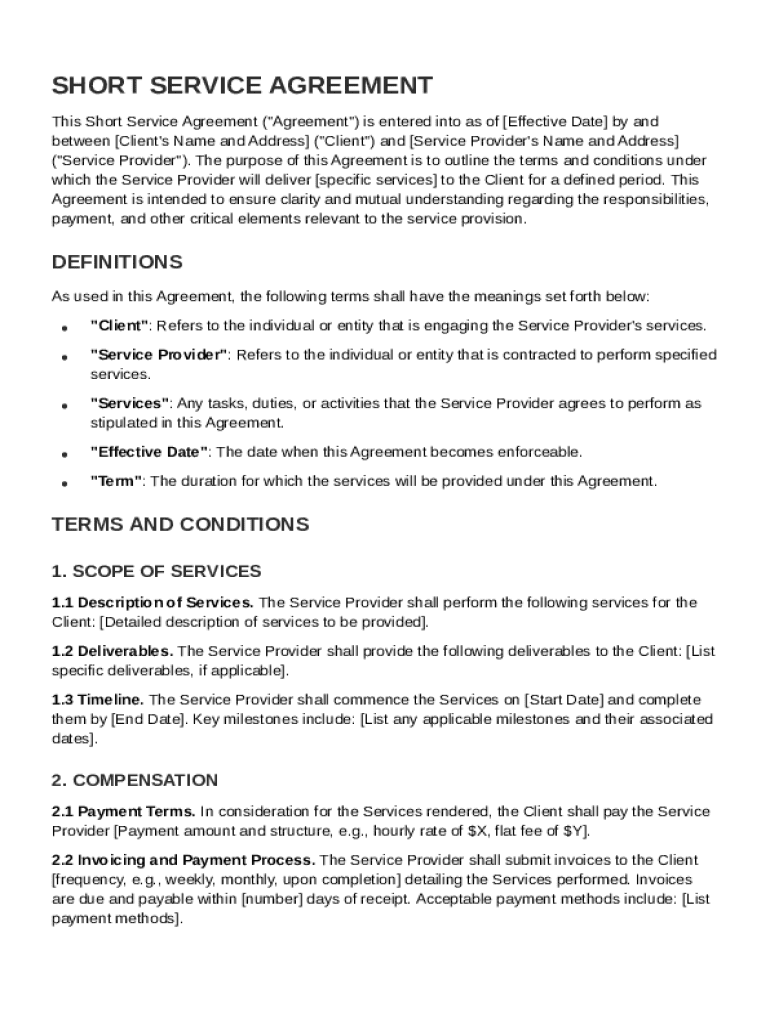 A Short Service Agreement Template is a document outlining the terms and conditions for a brief service arrangement between parties.