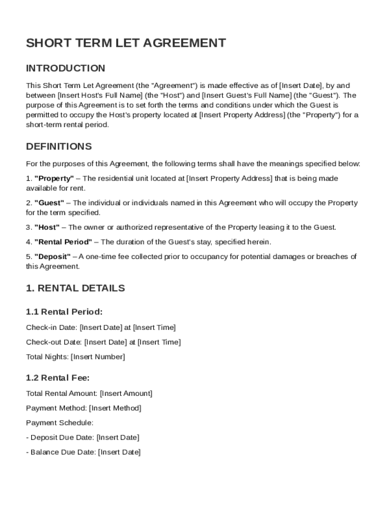 A Short Term Let Agreement Template is a legal document that outlines the terms and conditions for renting a property for a short duration.