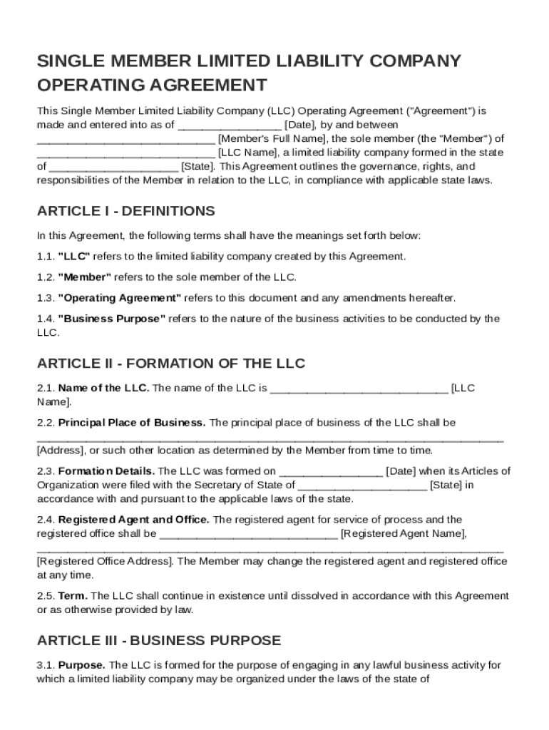 A Single Member LLC Operating Agreement Template is a legal document outlining the management structure and operational guidelines for a single-member limited liability company.