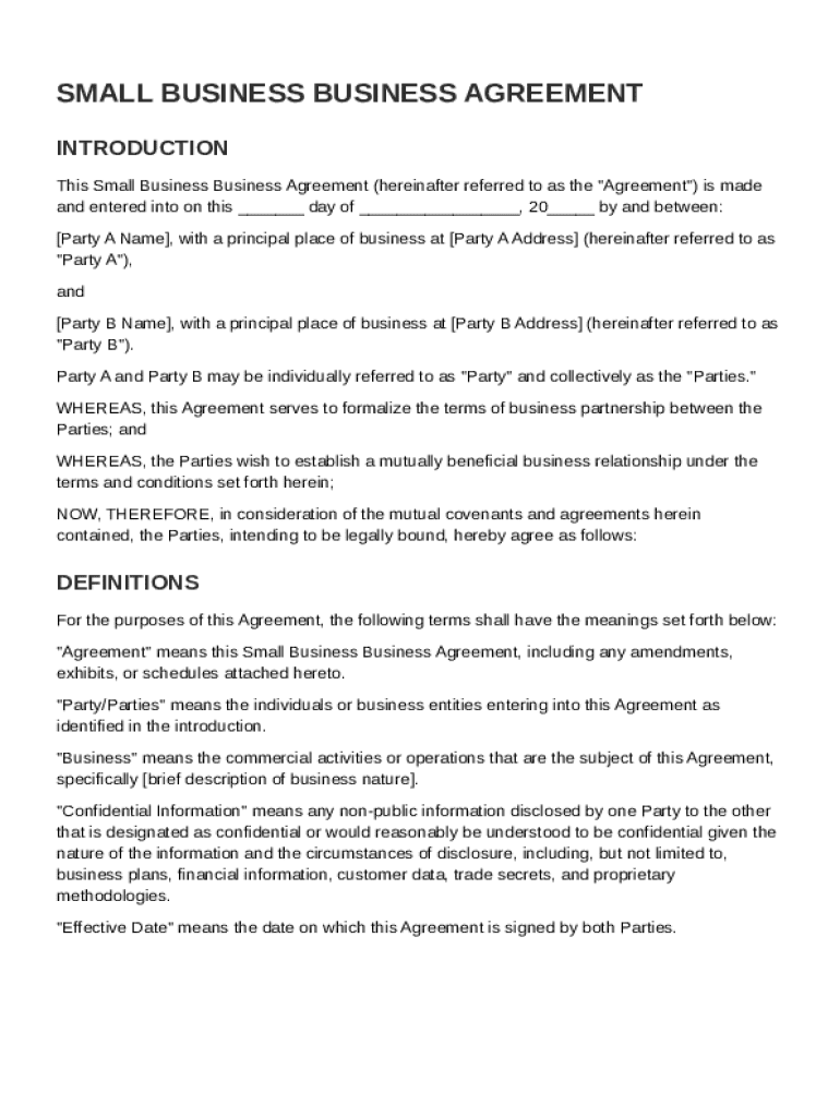 A Small Business Business Agreement Template is a legal document outlining the terms of a business relationship between two or more parties.