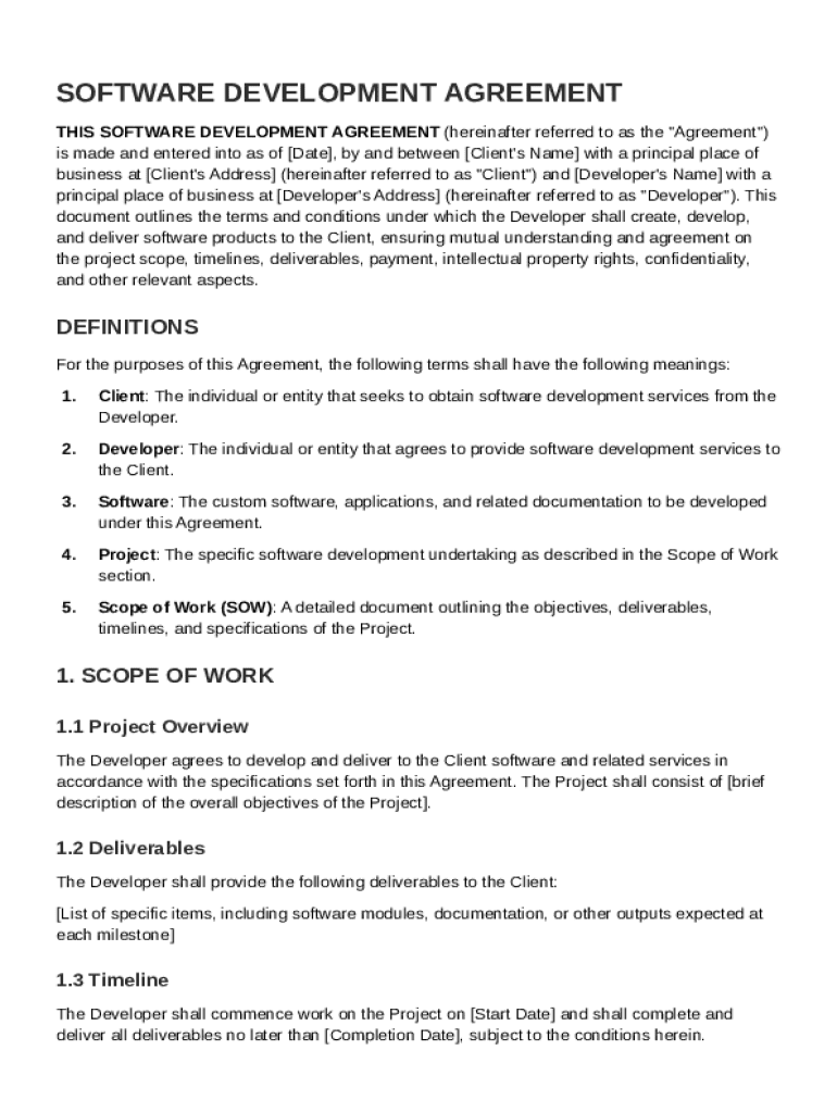 This document outlines the terms and conditions under which the Developer shall create, develop, and deliver software products to the Client, ensuring mutual understanding and agreement on project