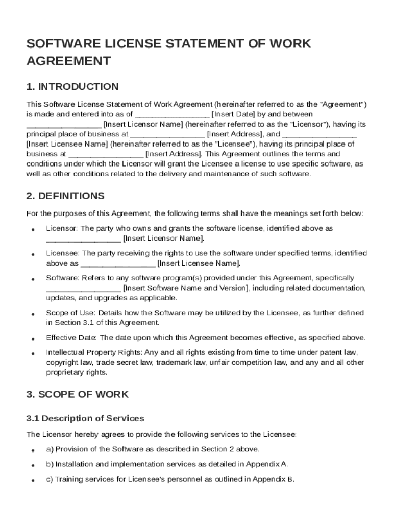 A Software License Statement of Work Agreement Template is a formal document that outlines the terms and conditions regarding the license of a software product.