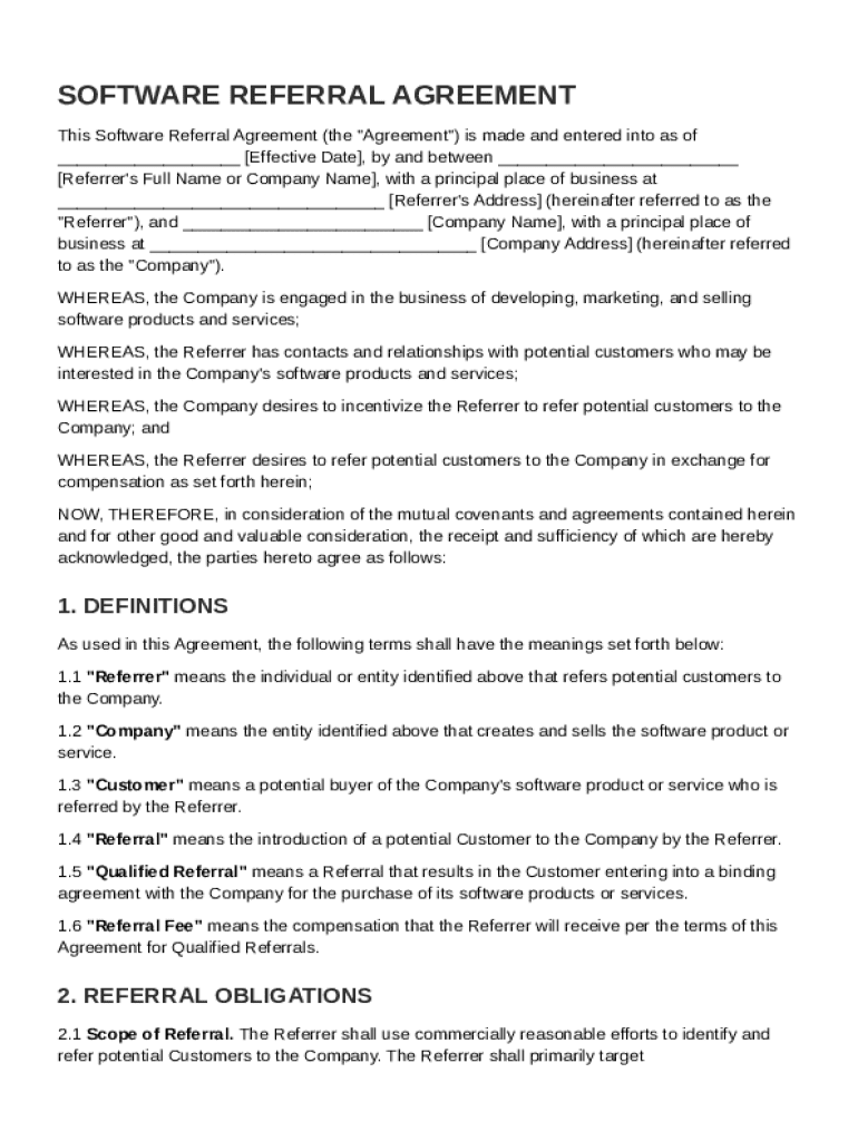This document outlines the terms and conditions between a Referrer and a Company for referring potential customers to the Company\'s software products in exchange for referral fees.